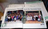 Tra le riviste archiviate si vede anche questa pagina pubblicitaria di Apple, dove il team di sviluppo del Macintosh (quelli dell'Apple ][ stavano in cantina) si faceva orgogliosamente fotografare, Jobs compreso, davanti all'entrata della vecchia sede di Apple. |