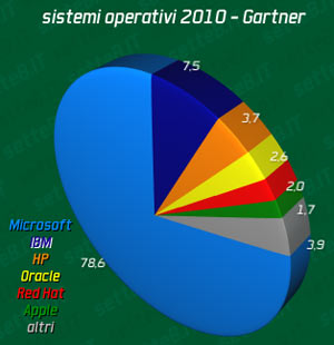 Tra client e server domina da tempo Windows, in tutte le sue varianti, con una quota del 78,6% (con corposi fatturati di 21,9 miliardi di dollari per Microsoft), in aumento dell’8,8% sul 2009. Seguono IBM con (principalmente) AIX per sistemi Power per il 7,5% (+5,6%), HP con HP-UX per il 3,7% (+1,4), Oracle con l’acquisito Solaris da Sun per il 2,6% (+7.682,8%), Red Hat con la sua versione di Linux RHEL per il 2% (+18%) ed infine Apple con Mac OS X per l’1,7% (+15,8%). Altri occupano il 3,9% del mercato ma arretrano del 39,9%.