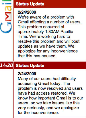 Aggiornamento del 24/02/2009: ora Google informa che i problemi sarebbero stati risolti dopo 2 ore e mezza di offline (diciamo poco meno di 4, invece). I messaggi di prova che abbiamo inviato ore fa però non sono ancora completamente stati recapitati al destinatario.