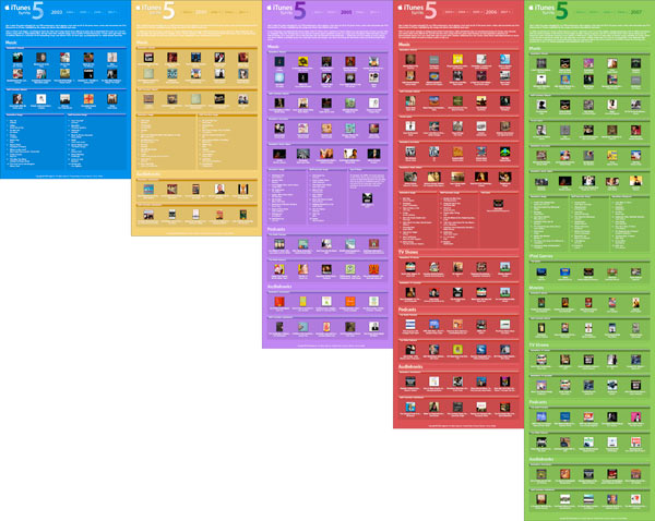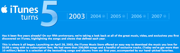 Oggi è comparsa su iTunes Store USA una sezione celebrativa di questi cinque anni, con le evoluzioni del listino del negozio multimediale, anno per anno, comprensivo dei best seller.