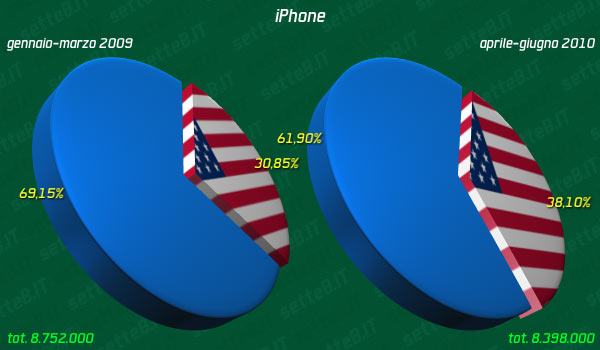 Con 3,2 milioni di attivazioni su rete AT&T (il 27% nuovi clienti) gli Stati Uniti passano dal 30,85% del trimestre precedente al 38,1% su un totale di 8.398.000 iPhone venduti da Apple in tutto il mondo nel terzo trimestre fiscale.