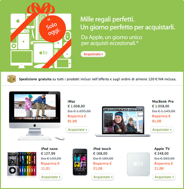 Saranno dispiaciuti i clienti dell’Apple Store che speravano di vedere i nuovi Magic Mouse MacBook (bianco) e Mac mini scontati. Non solo in Italia è ammessa la spedizione, per il secondo anno Apple consente di regalare e far recapitare questi prodotti in 15 paesi europei.