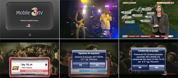 I canali gratuiti che si possono seguire via rete 3G (non via Wi-Fi) sono: La3, La3 Live, La3 Cinema, Mediaset (il meglio da Canale 5, Italia 1 e Rete 4), Boing e Sky Meteo24. A pagamento settimanale da 3 euro sono disponibili: Sky News (Sky TG24 e Sky Sport24), Sky Tempo Libero (Sky Uno Mobile, Fx Mobile e Fox One) e Cartoon Network. A pagamento giornaliero da 4 euro sono disponibili le partite di Serie A (Inter, Juventus, Milan, Roma e Lazio) e Champions League. Ci sarebbe anche il canale MotoGP al costo di 4 euro per 3 giorni ma attualmente la stagione 2009 è conclusa.