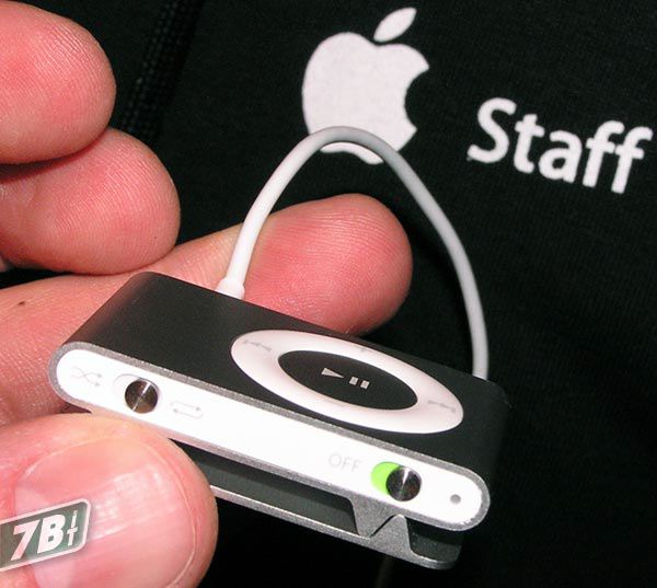 I tasti del random e dell'accensione presenti su un bordo del piccolissimo iPod shuffle.