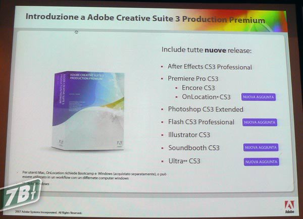 Ecco la lista dei software che si trovano nella suite Production Premium. Dall'acquisizione di Serious Magic da parte di Adobe arrivano i due ottimi OnLocation CS3 e Ultra CS3. Il primo (strumenti di misura broadcast) farà parte della suite per Mac ma dovrà girare in emulazione su Boot Camp, il secondo (effetti Blue Back molto curati) non ne farà parte.