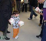 Non si capisce se tiene più stretto il suo ciuccio o la scatola con la T-shirt dell'Apple Store. |