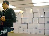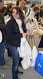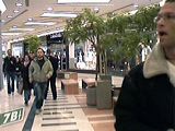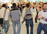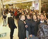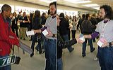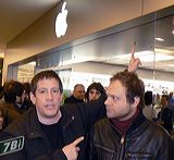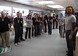 ...da diverse ore un nutrito gruppo di visitatori del centro commerciale (a parte le "casalinghe disperate" in cerca di lavatrici sotto-costo annunciate da Saturn, gli altri sono venuti per Apple) staziona fuori dagli ingressi, ecco che indossano le nostre T-shirt. |