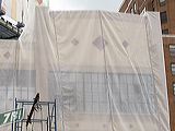 Diamo un'occhiata da vicino alla parte superiore. Sotto ai teli si intravede la decorazione della facciata. |