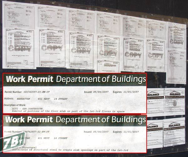 Ecco la lunga lista di permessi di costruzione mostrati all'esterno. Nell'ingrandimento notiamo due cose interessanti: le date di scadenza dei permessi "primo novembre 2007" e la descrizione di alcuni lavori "slab opening su parte del primo fino al terzo piano"...