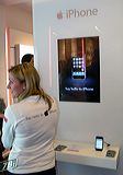 ...davanti ad uno dei chioschi dimostrativi un'addetta del negozio che illustra l'iPhone nelle funzioni principali... |