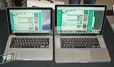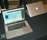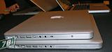 ...il MacBook da 13,3" ed il MacBook Pro da 15,4", uno accanto all'altro, con lo schermo di tipo LED al massimo dell'inclinazione... |