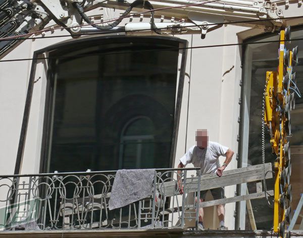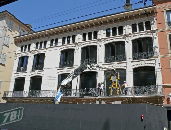 ...il lavoro è quasi completato sulle finestre del primo piano con balcone, mentre al secondo (chissà se occupato da Apple?) vediamo vetrate a 4 aperture...