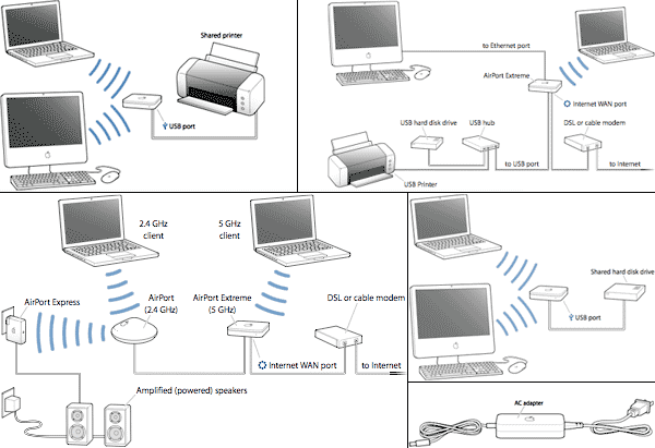 Come per le precedenti basi AirPort anche con la nuova Extreme permette la stampa senza fili, le modalità suggerite per l'installazione sono due: quella semplificata del collegamento via USB alla base e quella più complessa dell'utilizzo di un hub USB, per approfittare anche della modalità di condivisione di un hard disk su rete wireless.