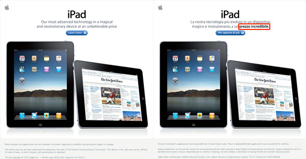 Per esempio gli abbonati alle newsletter di Apple avranno notato che nel messaggio rivolto agli statunitensi lo slogan scelto per iPad è stato: “our most advanced technology in a magical and revolutionary device at an unbelievable price”. Fedeli alla linea i traduttori di Apple fanno cadere nel ridicolo il nuovo prodotto, che prezzo in tutti gli altri paesi del mondo ancora non ha, con “la nostra tecnologia più evoluta in un dispositivo magico e rivoluzionario, a un prezzo incredibile”.
