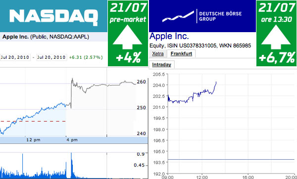 Aggiornamento del 21/07/2010: al TG1 Economia delle ore 14 Marzio Quaglino ha detto che il mercato viene trascinato da Apple “nonostante i risultati economici di ieri non troppo lusinghieri”. Non sappiamo che risultati abbiano letto per dare questa informazione tanto accurata.