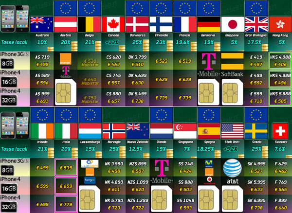 Che l’iPhone 4 senza contratto venduto in Francia costasse 30 o 40 euro meno di quello analogo venduto in Italia noi ce ne eravamo accorti immediatamente, fin dall’ufficializzazione dei prezzi del 26 luglio. Poi abbiamo approfondito ed abbiamo verificato che su 22 nazioni, 7 delle quali senza la versione “SIM free”, l’Italia era in assoluto il paese con i costi maggiori.