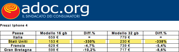 La critica fatta sul prezzo dell’iPhone 4 con una ricerca di ore di prezzi e conferme (inevase da Apple), di approfondimenti delle tasse locali, di verifica sui siti dei carrier locali internazionali, ha dimostrato come l’Italia è stata incredibilmente penalizzata con 659 e 779 euro di prezzo dell’ultima generazione di smartphone. Ma ecco che salta fuori ADOC – Associazione per la Difesa e l’Orientamento dei Consumatori con una tabella fatta frettolosamente, con numeri illusori ed ovviamente “Iphone 4″ scritto male.