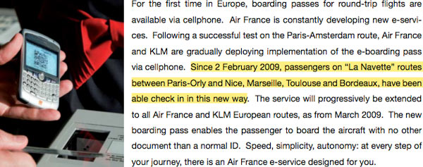 Durante il 2009, a partire da marzo, Air France-KLM prevede di estendere ad altre rotte europee il sistema. Basterà un documento d'identità e la conferma del biglietto arrivata per email nel telefono cellulare.
