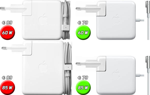 Il vantaggio dei “nuovi” modelli non è solo il connettore più compatto e, nel caso dell’alimentatore più potente le dimensioni e peso, ma anche il prezzo: il “vecchio 85 W” costa 89 euro ed il “nuovo 85 W” 79 euro, il “vecchio 60 W” 89 euro ed il “nuovo 60 W” 79 euro.