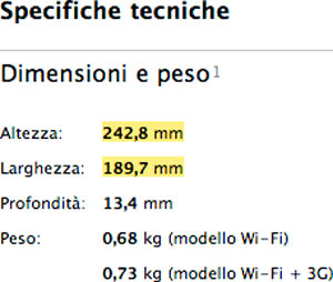 Da notare che Apple sul suo sito indica 242,8 x 189,7 mm mentre nei grafici forniti a FCC si legge 243,1 x 189,8 mm. Quale sarà la misura giusta?
