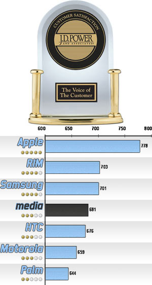 Tra i maggiori produttori di smartphone i 1.388 intervistati (tra agosto e settembre) hanno votato principalmente Apple, che ha guadagnato ben 778 punti sui 1.000 disponibili. Seguono i BlackBerry di RIM e Samsung con, rispettivamente, 703 e 701 punti. Apple, RIM e Samsung hanno ottenuto un punteggio superiore alla media del settore di 681 punti. Sono sotto alla media HTC, Motorola e Palm, che ottengono 676, 659 e 644 voti.
