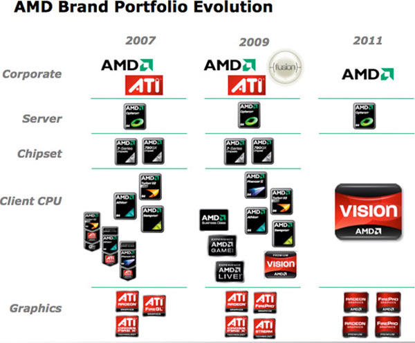 AMD ha fatto sapere a qualche testata USA (un comunicato ufficiale non è stato pubblicato) che dal 2011 le GPU ancora marchiate ATI sostituiranno la denominazione con AMD, la decisione è stata presa dopo aver verificato che sul mercato la maggior parte delle persone (3 su 1) riconosce i prodotti come AMD e non più ATI.