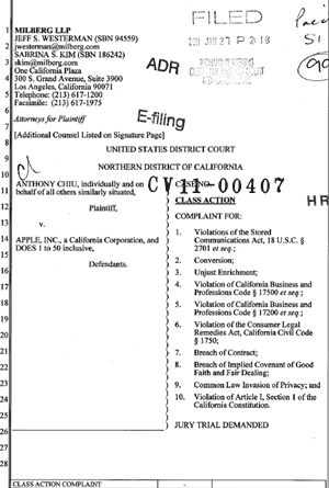 IDG News segnala la causa fatta questa volta dall’ufficio di Los Angeles dell’ufficio legale Milberg, rappresentato dagli avvocati Sabrina Kim e Jeff Westerman.
