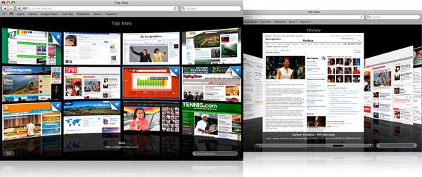 Secondo Apple si tratta del più innovativo e veloce della sua categoria, supporta standard moderni come HTML5 (che formalmente standard ancora non è) e CSS Effects. Esteticamente spiccano le visioni di più pagine con Top Sites o lo scorrimento tipo Cover Flow. “Sotto” c’è però il rendering Nitro che fa faville con i JavaScript rendendoli rapidissimi.