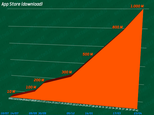 Da quando Apple ha avviato il conto alla rovescia verso il miliardo (le ore 18:01 di venerdì 10 aprile) sono stati scaricati 71 milioni e mezzo di software per iPhone/iPod touch, alcuni a pagamento ed alcuni gratis. Gli ultimi 2 milioni di file sono stati scaricati in 6 ore e 41 minuti, i 999 milioni scattavano alle ore 19:20 di oggi.