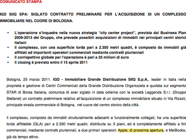 Venerdì scorso, con il comunicato stampa che vedete qui sotto, IGD SiiQ – Immobiliare Grande Distribuzione Società di investimento immobiliare Quotata ha fatto sapere di aver acquisito dalla società Leggenda del gruppo Stefanel la proprietà di una parte della palazzina di via Rizzoli (interrato, piano terra e primo piano per 2.350 metri quadrati affittabili), che prima dava gli spazi al loro negozio e che prossimamente invece si aprirà sotto le insegne dell’azienda di Cupertino.
