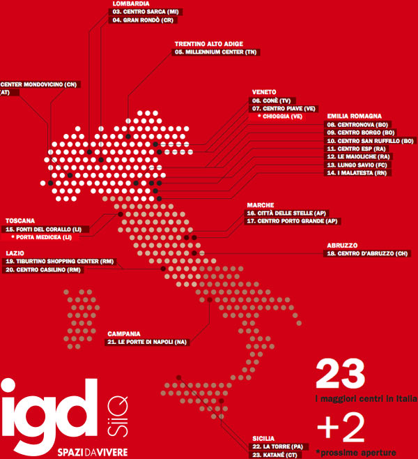 Apple Retail Italia pagherà quindi l’affitto ad una società che gestisce il patrimonio immobiliare Coop Adriatica e Unicoop Tirreno. La loro specialità sono i centri commerciali, ecco nella mappa sottostante quanti ne hanno nel nostro paese, per non citare le proprietà in Romania.