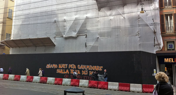 L’immagine sottostante (pubblicata da Massimo Mantellini) dimostra che i lavori esterni al negozio bolognese sono ormai terminati, è tutto completamente impacchettato e pure la barricata nera è ora chiusa su tutti i lati. Completa anche di qualche immancabile graffito, si ringraziano gli artisti di turno per l’opera immortale, fino alla prossima mano di vernice nera.