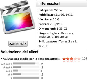 Richard Townhill, il responsabile del marketing di Apple per le applicazioni, ha dichiarato che questo aggiornamento ha tenuto conto delle richieste fatte dai professionisti che usavano con soddisfazione Final Cut. Prima di Final Cut Pro X però, infatti l’editor video di nuova generazione, rilasciato lo scorso 21 giugno esclusivamente su Mac App Store ad un prezzo di 240 euro, aveva insoddisfatto molti (come si vede accanto).
