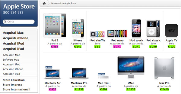 Qui è come si presentava l’Apple Store online fino a ieri, di seguito riportiamo il “balletto” dei prezzi sull’hardware principale con passaggio dal 20 al 21% d’IVA e poi l’eventuale correzione senza centesimi (a parte un solo caso). In rosso quelle svantaggiose (seppur per pochissimi) ed in verde le correzioni vantaggiose.