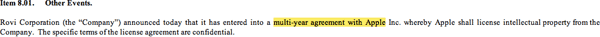 La società nota fino al 2009 come Macrovision e che ora si chiama Rovi ha pubblicato un documento per la SEC che annuncia un accordo con Apple.