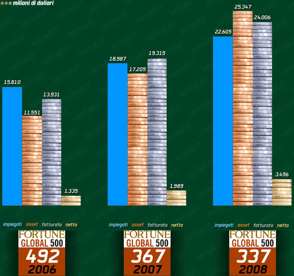 Le aziende USA dominano la classifica ma calano da 176 a 153 nell'ultimo anno, segue il Giappone con 64 aziende (erano 81 nel 2007) poi tocca alla Francia (con 39 società) e alla Germania (37 aziende). L'Italia è l'11esima nazione dietro alla Spagna con 10 società nel Fortune 500 Global, 2 in più rispetto all'anno prima.