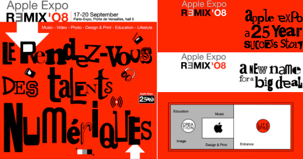 Tra il 17 ed il 20 settembre l'Apple Expo remix'08, così si chiamerà la 25esima edizione del 2008, accoglierà i visitatori a Porte de Versailles. Esporranno "solo" le terze parti, Apple sarà assente, nonostante la presentazione dell'evento indichi chiaramente il logo dell'azienda di Cupertino nel centro dell'area a disposizione.