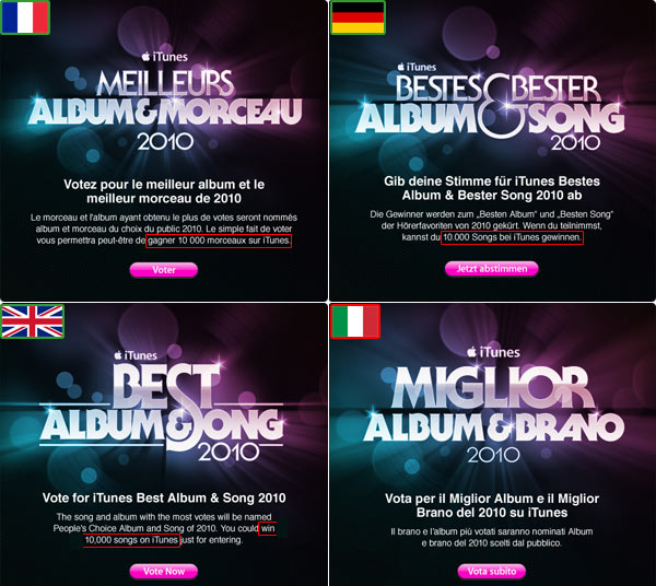 Subito ci siamo però chiesti cosa ci fosse in palio, nella descrizione di poche righe in italiano si citavano fantomatici vincitori ma nient’altro. Nelle versioni degli altri paesi dello stesso sito si legge invece che esiste un concorso e che gli estratti a sorte tra chi voterà potranno scaricare gratuitamente dal rispettivo iTunes Store 10.000 canzoni, gratis.