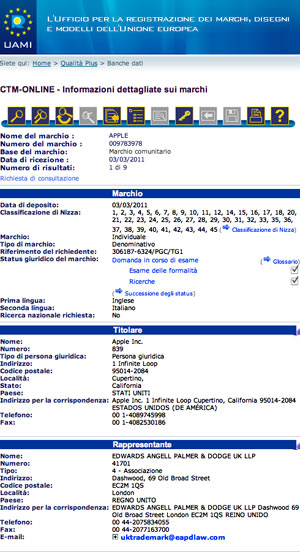 Apple ha registrato presso l’UAMI – Ufficio per la Registrazione dei Marchi, Disegni e Modelli dell’Unione Europea il proprio nome sotto ben 43 classi di prodotto. Insomma, tutte le categorie tranne la 13 e la 19 (armi da fuoco, munizioni, proiettili, esplosivi, fuochi d’artificio per la prima e materiali da costruzione non metallici, tubi rigidi non metallici per la costruzione, asfalto, pece, bitume, costruzioni trasportabili non metalliche, monumenti non metallici per la seconda).