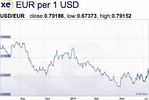 Come noto, tutti i giorni, i prezzi delle monete estere cambiano in base alle contrattazioni (accanto vediamo gli ultimi 12 mesi di quanto è costato in euro 1 biglietto verde), ma è evidente che non è possibile modificare i listini dei prodotti ogni 24 ore, anche se tecnicamente fattibile vista l’alta sincronizzazione a tutti i livelli.