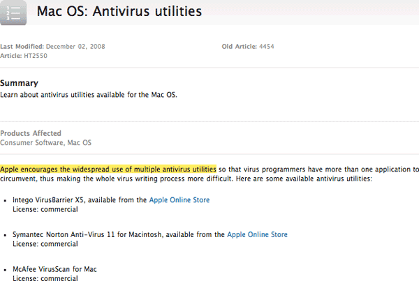 Mercoledì scorso setteB.IT si accorgeva (grazie al blog di Intego) che Apple raccomandava l'uso di multiple risorse per difendersi dai virus informativi, citando le applicazioni di Intego, Symantec e McAfee.