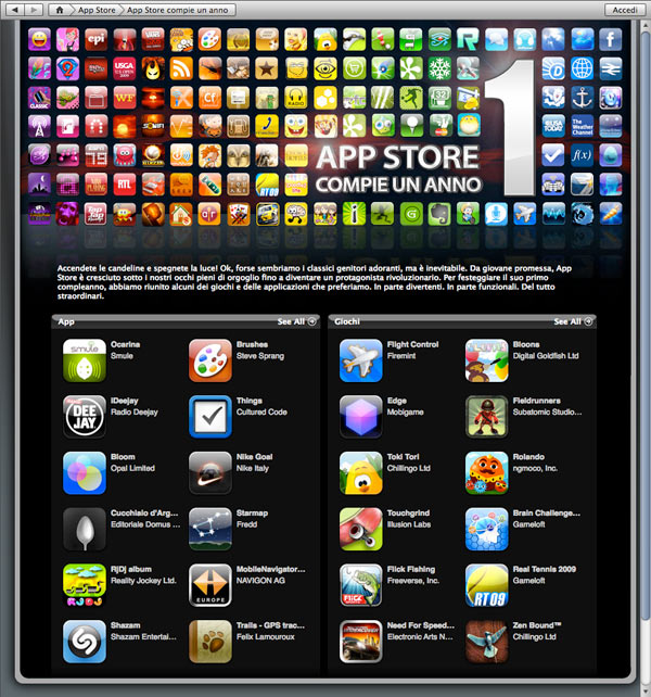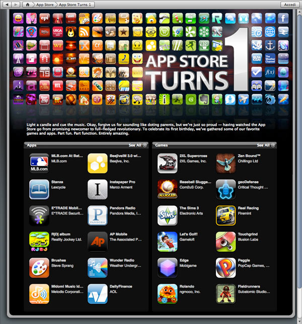Con una pagina celebrativa Apple ricorda che un anno fa sono stati i primi ad avere l'idea geniale del negozio di software per dispositivi mobile. Tutti hanno poi tentato di imitarlo.