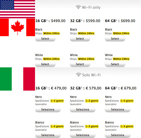 Se allora Apple Store Italia (ed altre nazioni) indicava “3-5 giorni lavorativi”, adesso, con il solito scoppio ritardato che l’azienda californiana riserva a tutto quello che succede fuori dal mercato nazionale/limitrofo, si legge “1-3 giorni lavorativi”. Probabilmente tra un paio di settimane anche sui mercati internazionali le spedizioni di iPad 2 avverranno entro le 24 ore.