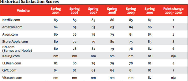 Al primo posto per il sesto anno consecutivo c’è il noleggiatore di film Netflix seguito da Amazon con, rispettivamente, 87 ed 83 punti. Tutti i siti sul podio hanno guadagnato 2 punti sulla classifica del 2009 mentre Apple avanza di 8 punti, il quinto miglior progresso di tutti i rivenditori online.