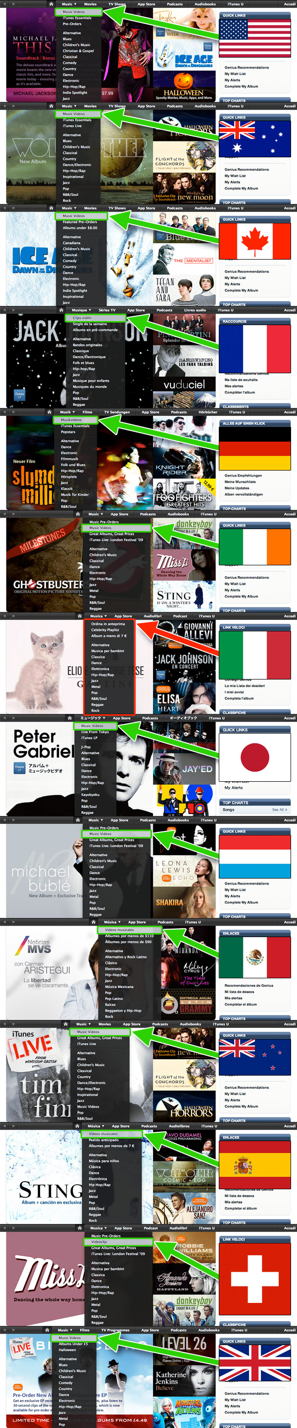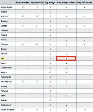 Aggiornamento del 30/10/2009: Apple si è mossa rapidamente, in tarda serata la tabella del pomeriggio (qui una cache) è magicamente cambiata e (purtroppo) è scomparsa l'indicazione dei videoclip per l'Italia. Tutti i clienti dell'iTunes Store del nostro paese avrebbero preferito certamente che fosse la volta buona per introdurre i video, invece ancora no! Grazie al lettore che ce lo ha prontamente segnalato e che preferisce rimanere anonimo.