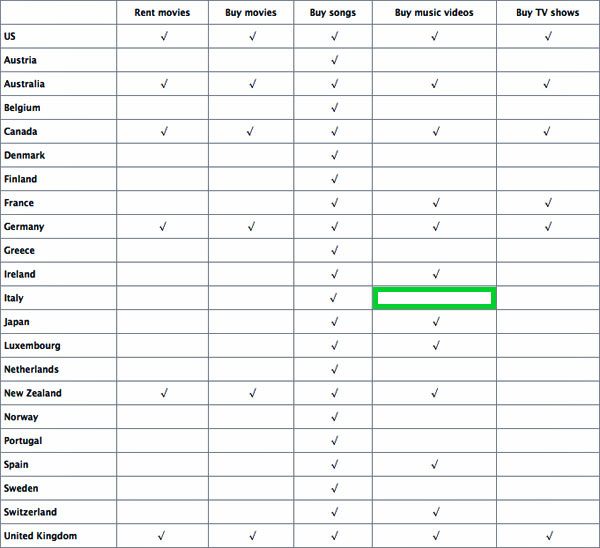 Tra qualche giorno, come è già successo in passato, Apple potrebbe correggere la tabella. Sarebbe meglio che la tabella rimanesse così ma che si adoperassero per fare questo primo atteso passo verso la vendita di videoclip anche nel nostro paese, come già fanno svariati altri negozi online che operano in Italia.