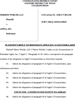 Dei 4 brevetti reclamati da Mirror Worlds Technologies (6.006.227, 6.638.313, 6.725.427 e 6.768.999) ne sono rimasti validi solo 3 nella causa 6:08cv88 fatta ad Apple.