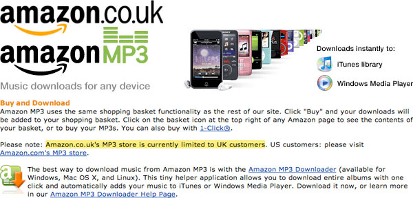 Anche Amazon è stata costretta dalle major della musica, al pari di Apple, a creare un negozio per ogni singola nazione e così Amazon MP3 UK potrà accogliere solo i clienti britannici, nonostante facciano parte di un unico mercato europeo di altre 26 nazioni UE.
