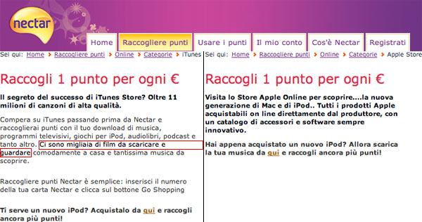 Il fatto che la versione italiana di Nectar sia stata troppo entusiasticamente “tradotta” dalla versione inglese, senza ampie verifiche, ce l’abbiamo leggendo che sull’iTunes Store nazionale ci sarebbero secondo loro “migliaia di film da scaricare e guardare”, quando sappiamo bene che né gli spettacoli televisivi né i film sono disponibili nella penisola. Tra l’altro il catalogo musicale non è più di 11 ma, dal 24 febbraio, di 12 milioni di brani.