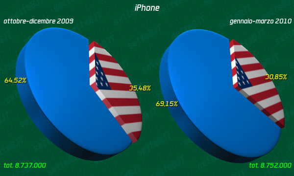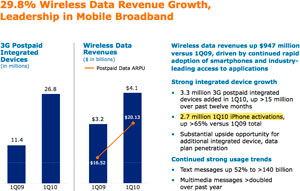 In questi primi 3 mesi del 2010 AT&T dichiara di aver effettuato 2,7 milioni di attivazioni di iPhone (+65% sul Qi del 2009), ovvero almeno il 30,85% di tutti gli 8.737.000 iPhone venduti in 88 paesi e con la collaborazione di 151 carrier locali.